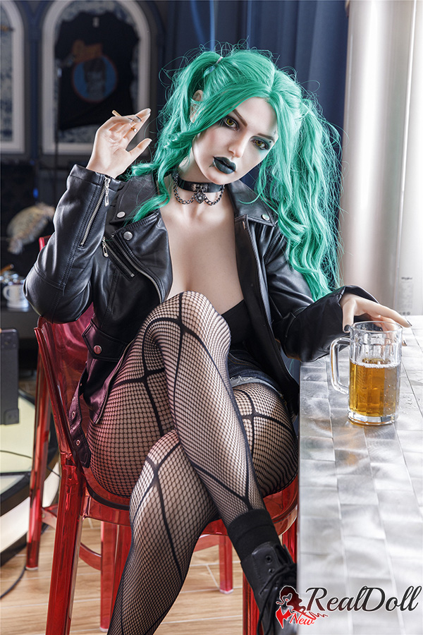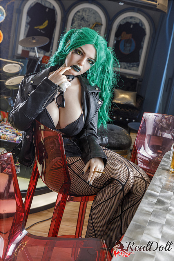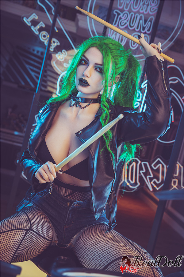 The long green hair cascades down her back in loose waves, standing out against her pale skin. Her clown girl make-up is vibrant and bold, with bright red lips and exaggerated black eyeliner. Fantasy sex doll wears fishnet stockings that hug her legs, adding a touch of edgy sensuality to her overall look. Together, these elements create a unique and striking appearance that demands attention.